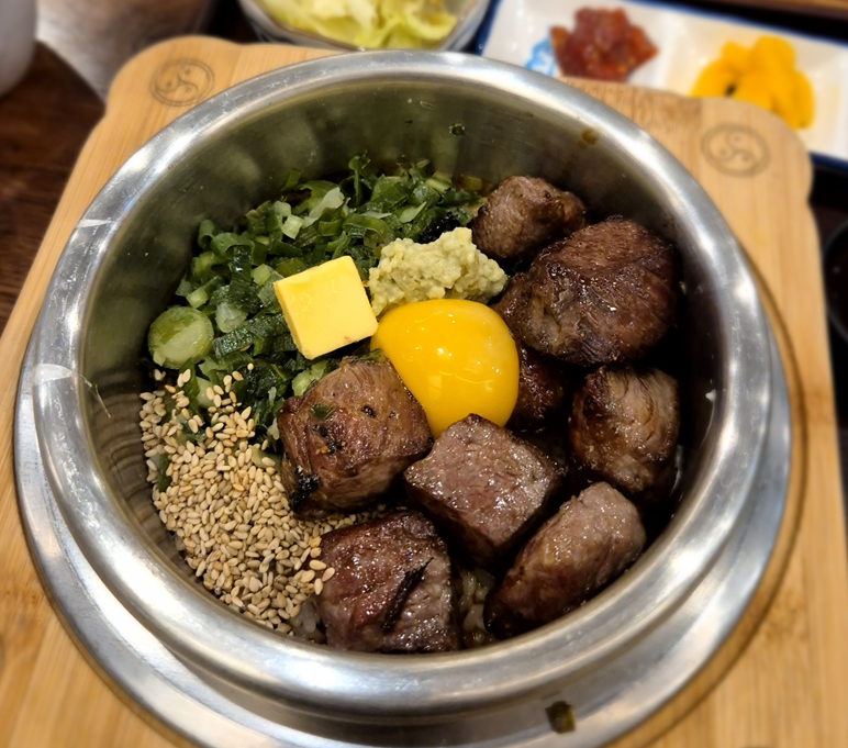 두툼한 스테이크가 올라간 스테이크 솥밥입니다. 소고기 스테이크에 버터가 들어가 고소하면서 소고기의 풍미를 더 해주는 솥밥입니다. 스테이크가 적절하게 잘 익어 질기지도 않고 고기에 간이 잘 배어서 밥과 함께 먹기 좋았습니다.