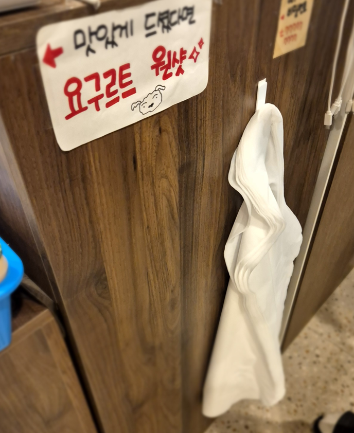 계산할 때 요구르트도 있어 입가심을 하기 좋더라고요.ㅎㅎ 계산하는 곳 밑에 앞치마도 있으니 참고하세요!