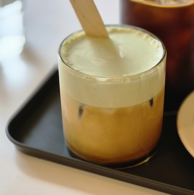 그리고 제가 주문한 피스타치오 캐러멜입니다! 피스타치오 크림과 커피가 분리되어 있는 것이 보이시죠?ㅎㅎ 생각보다 잘 섞이지 않아 열심히 저었는데, 다 섞이지 않은 맛으로 먹어도 좋더라고요! 피스타치오의 고소함과 커피의 쌉쌀한 맛이 잘 어울렸고, 크림의 단맛으로 시작해 깔끔하게 커피로 입맛을 마무리 할 수있는 음료였습니다. 아쉬운 건 몇 모금 마시니 금방 없어지더군요.ㅠㅠ 더 큰 사이즈로 주문하고 싶었습니다. ㅎㅎ