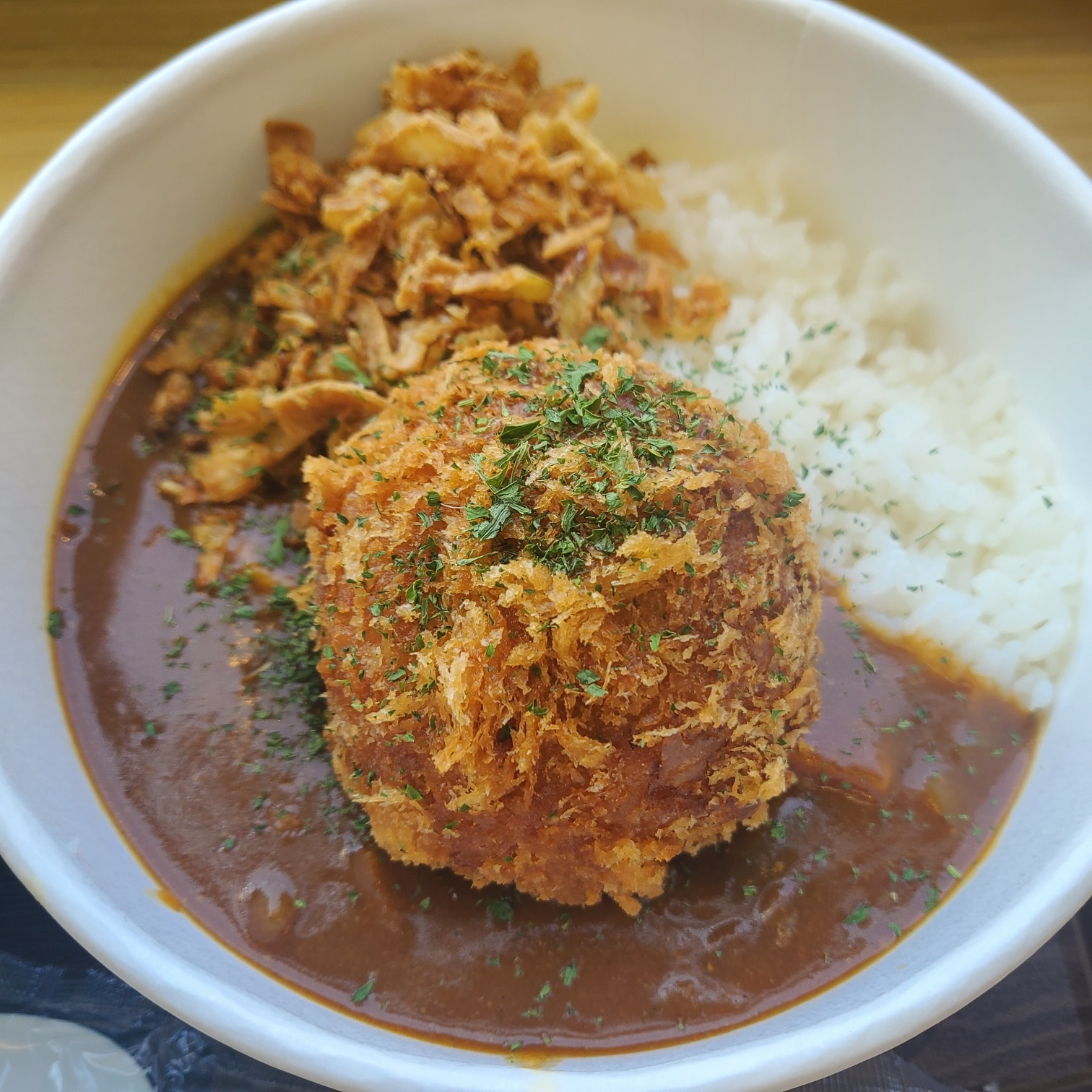 제가 주문한 치즈볼카레밥입니다!ㅎㅎ 흰밥 위에 카레가 올라오고 그 위로 마늘 후레이크와 치즈가 들어있는 볼카츠를 올려주세요!ㅎㅎ