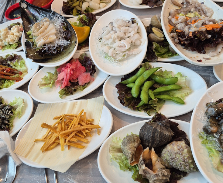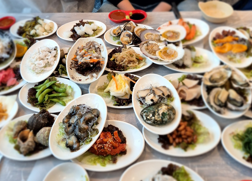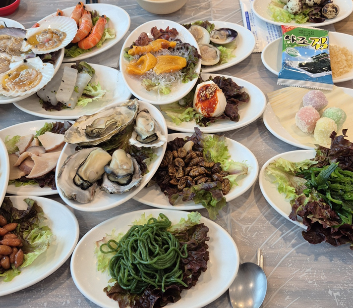 주문을 하면 바로 한상차림이 준비 됩니다.ㅎㅎ 신선한 해물이 올라간 접시 위에 접시를 포개고 먹으면 또 새로운 접시를 가져다주세요.ㅎㅎㅎ