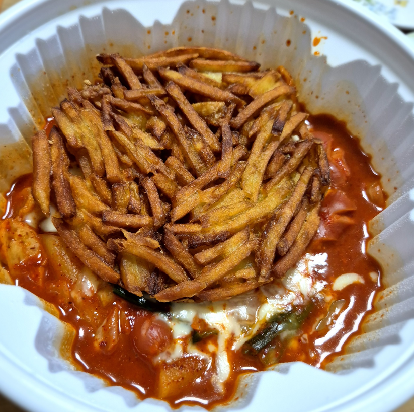 엽떡과 함께 종이 봉투에 담겨 감자채튀김이 왔습니다. 다들 떡볶이 위에 올리고 사진을 찍으시더라고요! 1인용 프라이팬 정도 사이즈가 되고, 우리가 아는 야채튀김 정도의 두께를 갖고 있습니다.