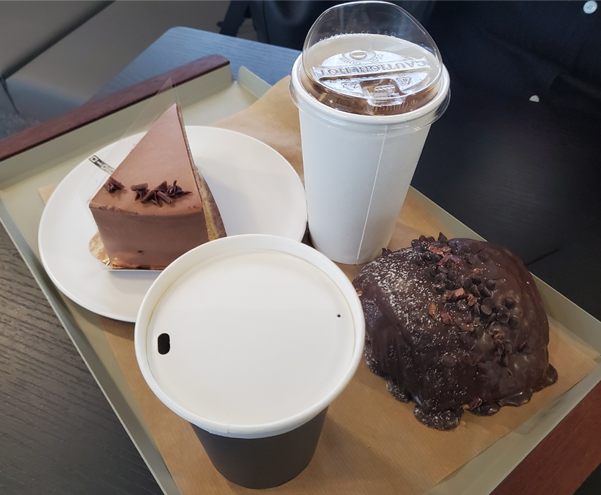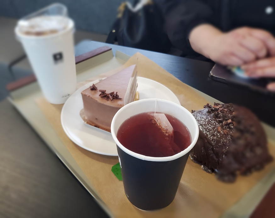 그리고 쇼콜라 샹띠 케이크, 더티초코를 주문했어요! 베이커리는 계산 시 바로 받을 수 있고 음료는 진동벨로 차후에 받을 수 있습니다! 애플유자티는 상큼하면서 사과향과 꽃향기가 많이 났어요! 그리고 달달한 유자 맛이 올라오면서 기분 좋은 맛을 줍니다! 다만 유자를 잘 섞어서 마셔야 하는데 스푼을 따로 주진 않으시더라고요!ㅠ 그래서 빨대로 휘휘 저었으나 뜨거운 물에 빨대는 또 금방 약해져 잘 저어져지 않았습니다.ㅠ