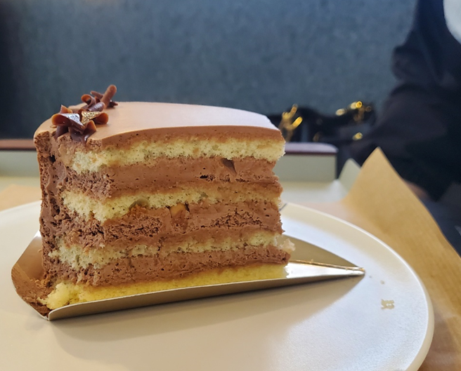 쇼콜라 샹티 입니다! 케이크 시트 겹겹으로 크림이 쌓여있어요! 그만큼 빵이 많이 촉촉했습니다! 퍽퍽한 맛이 없어서 먹기 좋았어요. ㅎㅎ