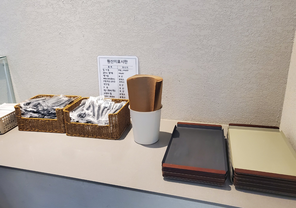 쟁반과 유산지, 포크, 나이프는 한 쪽에 준비되어 있어요! 아무래도 대형카페다 보니 빠르게 정리하고, 일거리를 줄이려다 보니 일회용품을 주로 사용하고 있었어요. 대체로 다회용 용기로 바뀌고 있는 요즘 트렌드를 자주 보다 보니 조금은 아쉬운 부분이었어요!