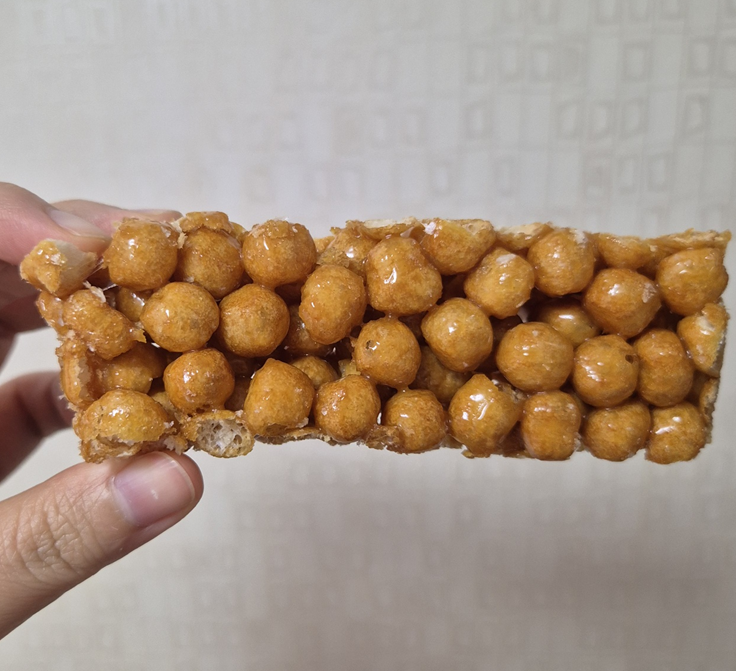 봉지를 뜯어 보면 윤기가 흐르는 오란다볼의 알갱이들을 볼 수 있습니다. 제가 실온에 오래 두어서 그런지 더 부드러웠고 만지는 대로 모양이 잡혔어요. 만약 더 바삭하고 딱딱한 식감을 원하신다면 냉장고에 넣어서 시원하게 드시는 게 좋을 것 같습니다.
