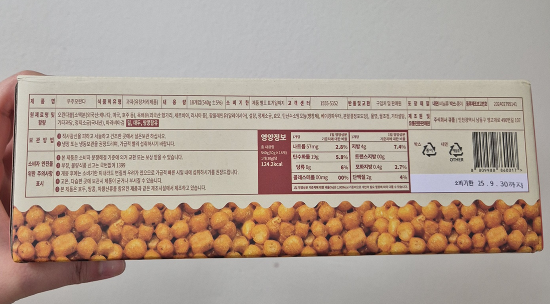 총 내용량 540g(30gX18개) / 1개(30g) 당 124.2Kcal밀, 대두 땅콩 함유