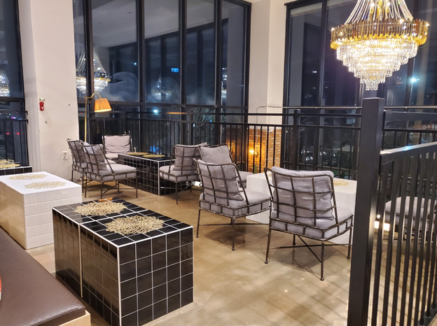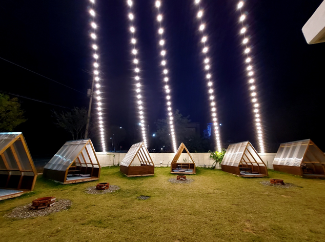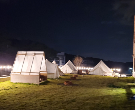건물을 돌아가면서 캠핑 라운지와 인디언 텐트가 있었습니다.