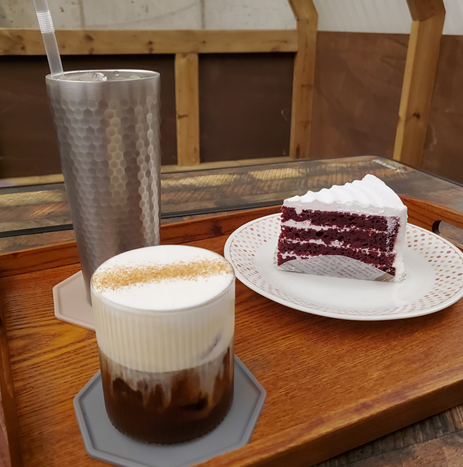 감사하게도 이 곳에 디카페인이 있었습니다. ㅎㅎ 저는 배가 불러서 아이스 아메리카노 디카페인으로 주문했고, 동행자는 아인슈페너를 시켰어요.ㅎㅎ 그리고 레드벨벳 케이크도 함께 주문했습니다. ㅎㅎ