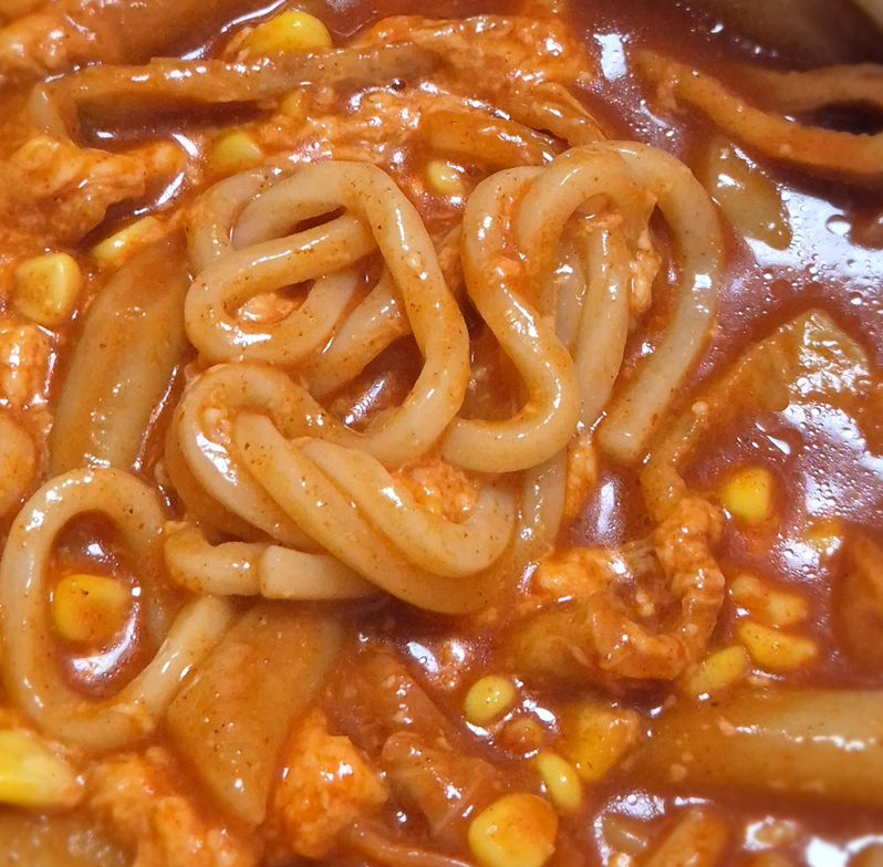응떡이 예전에는 부상맛도 꽤 매웠던 걸로 기억하는데 콘치즈와 우동면이 들어가서 그런지 전혀 맵지 않고 편하게 먹기 딱 좋았습니다.ㅎㅎ 면과 떡볶이 소스가 생각보다 잘 어울렸고, 치즈의 고소함과 옥수수의 달콤함과 식감이 우동의 맛을 더 증가시켰어요.ㅎㅎ