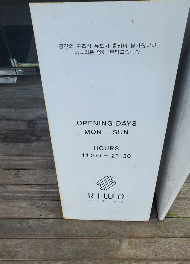 가게 앞에 입간판에는 월요일부터 일요일로 식당 운영을 한다고 있는데요, 어떤 포스팅은 화요일로도 나와있더라고요! 제가 확인했을 때에는 월요일이 휴무였는데, 혹시 모르니 월요일에 방문하실 때는 확인해보시는 게 좋을 것 같습니다:-) 아참, 주차가 정말 중요하죠! 주차 공간은 건물 앞에 넉넉하니 있습니다. 저희는 어중간한 시간에 가서 몇 대 없어서 편한 곳에 주차를 해서 들어갔어요. 아 그리고! 유모차 출입 불가하니 유아 동반하시는 분들도 알아두세요~