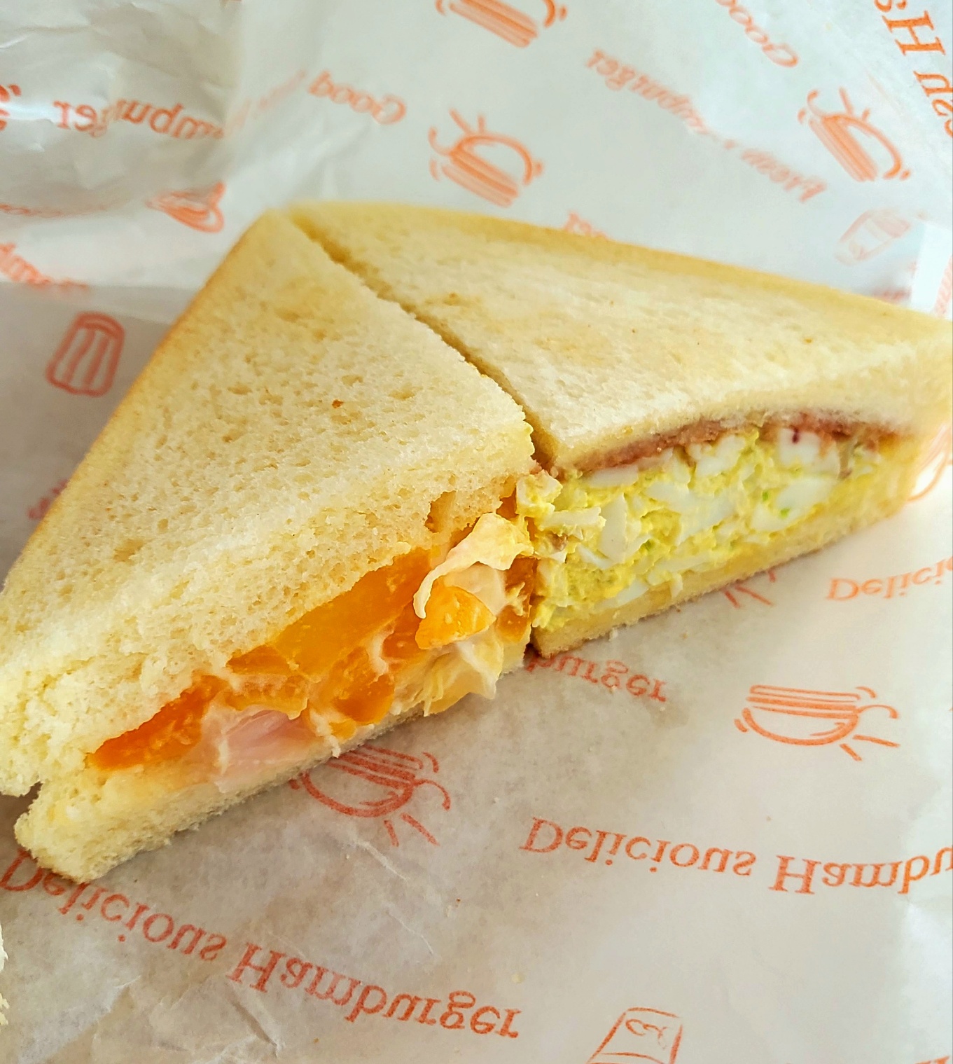 어떤 맛일지 궁금했는데 저는 과일 샌드위치와 계란 샌드위치 반반 들어있는 샌드위치였습니다!ㅎㅎ 아마 대량 주문으로 반반 샌드위치가 가능했던 거 같아요.ㅎㅎ 먹기 편하게 4등분으로 되어서 나눠 먹기도 좋아요!ㅎㅎ 계란 샌드위치는 직접 만드신 계란 샐러드를 두툼하게 넣어주셨고, 딸기잼까지 발라져 있어 풍미가 넘친다고 할 수 있어요!ㅎㅎㅎ 아마 계란 샐러드에 양파가 들어가 있어서 양파 식감과 향이 많이 났는데 호불호가 많이 갈릴 거 같단 생각이 들어요!