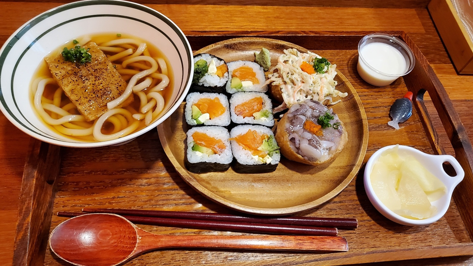 주문을 하고 테이블에 앉아 있으면 요리를 준비해서 바로 테이블 앞으로 전달을 해주십니다! 반끼 베스트 세트는 이런 모습이에요! 우동, 연어마끼, 타코유부, 크래미 유부, 단무지, 간장 그리고 푸딩! 한 상 차려주세요 ㅎㅎ 개인적으로 간장은 소분되어 나와서 낭비되지도 않고, 위생적으로도 청결하게 느껴져 좋더라고요!