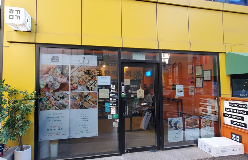 2호선에서 이대역 방면으로 얼마 가지 않아 공원 골목으로 들어가면 한끼마끼가 있습니다! 처음엔 눈에 띄지 않았는데 조금 가다 보니 노란색 가게를 보고 저기구나! 하는 확신을 가졌어요.ㅎㅎ