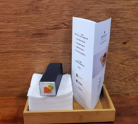 테이블마다 휴지와 식당과 어울리는 피규어들이 위치해 있고, 메뉴판도 함께 있습니다. ㅎㅎ 그리고 매장 이용 안내에 대해 적힌 종이가 붙어 있고, 맛있게 먹는 방법도 나와있어요! 마끼는 붕어 간장을 조금씩 뿌려먹고, 유부초밥은 그냥 드시면 되는 간단한 방법이지요!ㅎㅎ 무엇보다 궁금했던 푸딩에 대한 설명도 간단히 있습니다! 마끼 집에서 푸딩을 직접 만든다!? 꽤 호기심이 가는 부분이었어요!