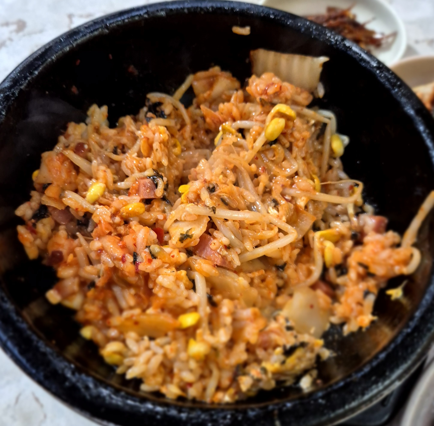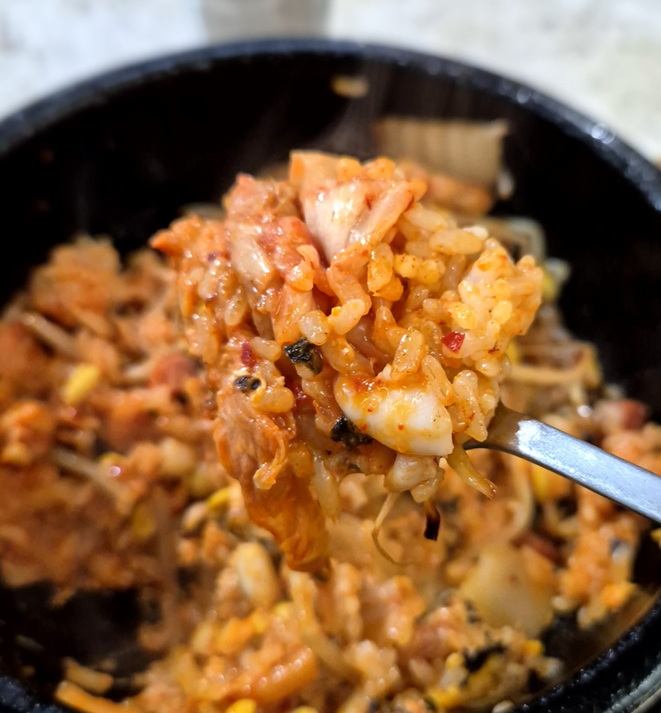 김치 맛이 강하면서 중간 중간 한 번씩 씹히는 오징어 식감이 맛을 더 가미시킵니다.ㅎㅎ 일반적으로 알고 있는 돌솥비빔밥과 다르고 김치가 기본이 되어 김치볶음밥에 더 가까운 맛을 가지고 있어요. 한국인뿐만 아니라 외국인들도 좋아할 것 같은 맛입니다.ㅎㅎ 물론 외국인들에게는 조금 매울 수 있어요.ㅎㅎ