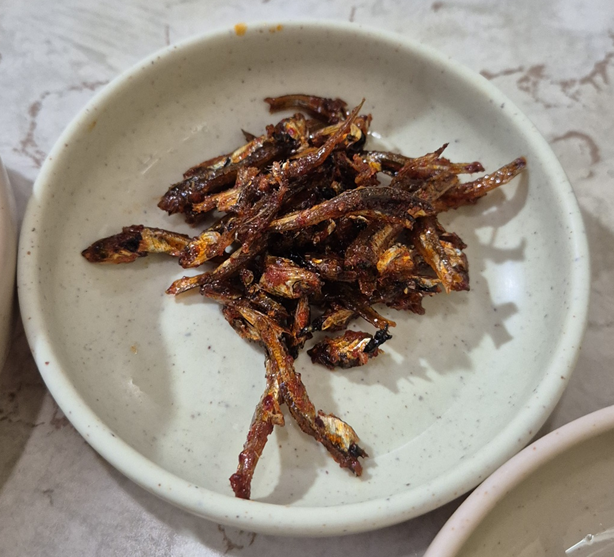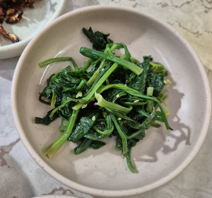 밑반찬으로는 김치, 두부, 시금치, 콩나물, 멸치볶음이 나옵니다.ㅎㅎ 투박하지만 그래도 넉넉하고 영양가 높은 반찬들이 제공돼요.ㅎㅎ