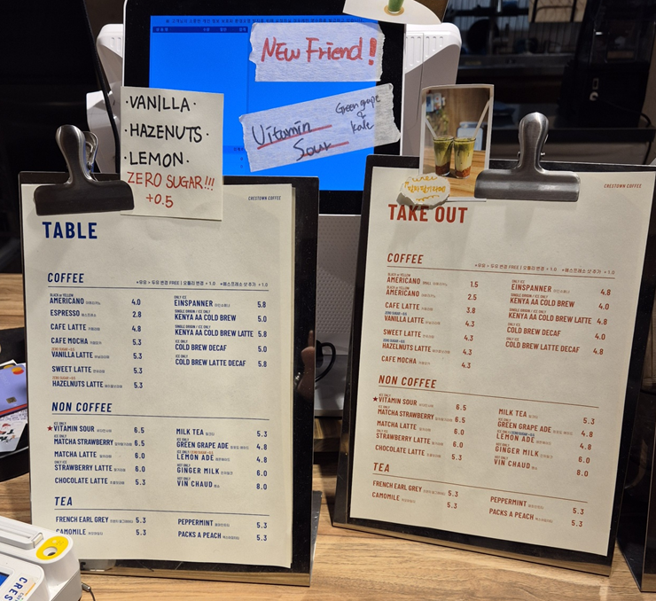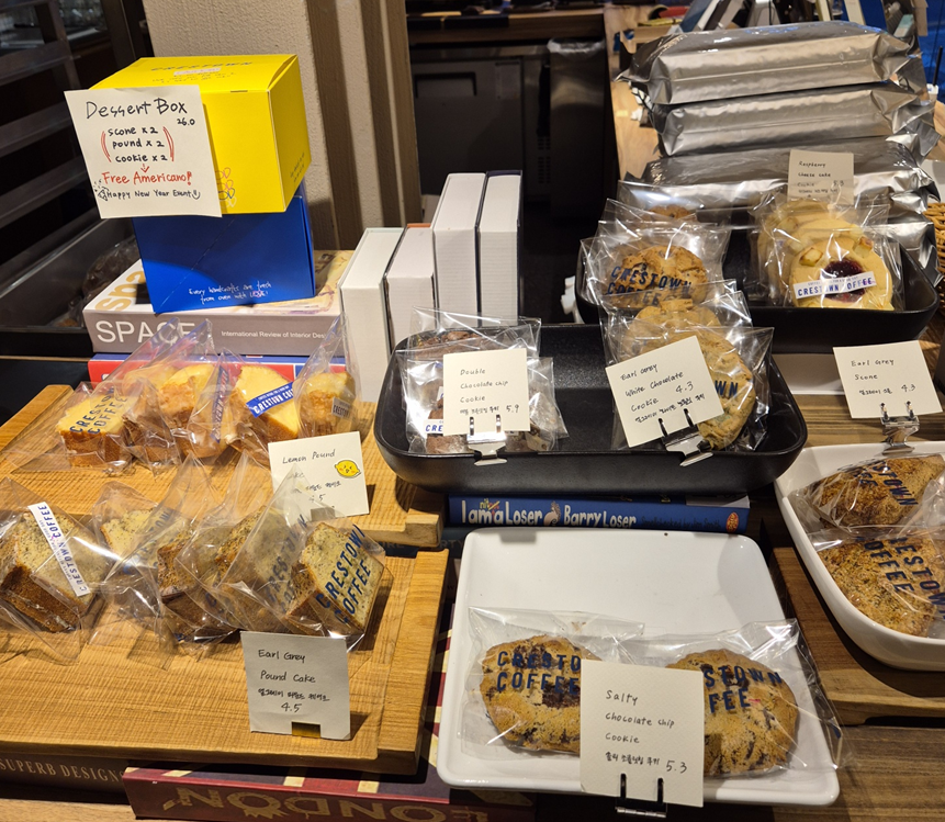 저는 출근 때 가서 이른 시간에 방문한지라 베이커리류는 아직 덜 나왔어요.ㅠㅠ 원래 크레스타운은 디저트도 맛집입니다.ㅎㅎ 저는 오늘 더 늦게 퇴근하게 돼서 점심용으로 샌드위치를 사러 갔는데 사실 샌드위치도 나오기 아직 이른 시간이었답니다..ㅠㅎㅎ 하지만 친절한 직원께서 바로 만들어 나올 거라고 준비해 주셨어요.ㅎㅎ
