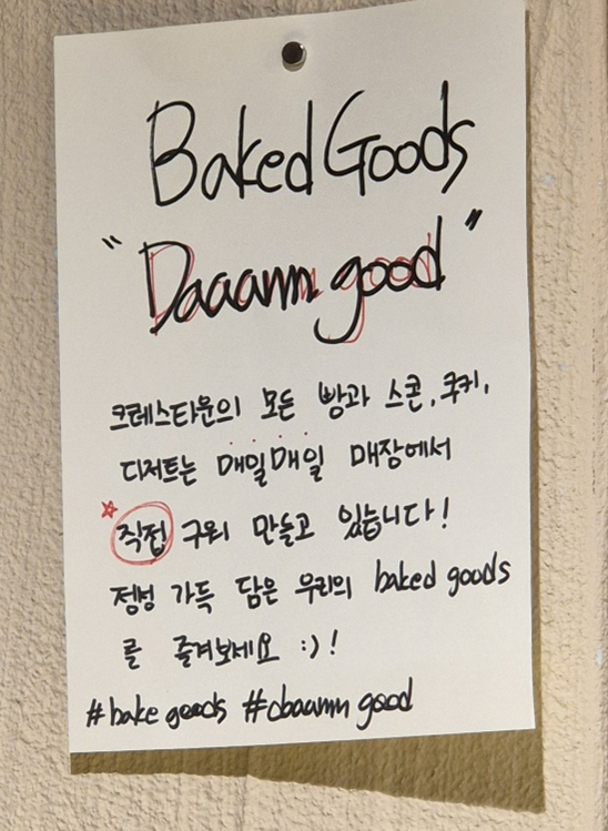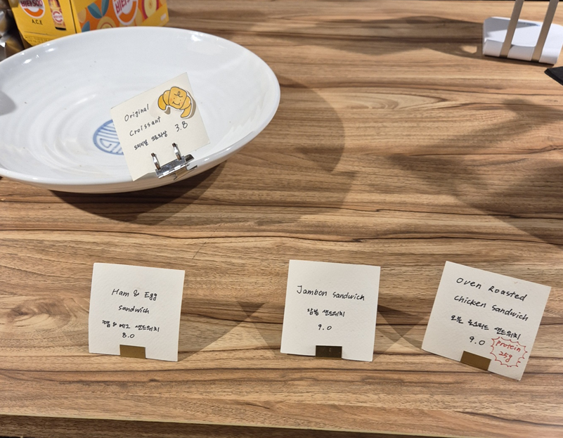 저는 출근 때 가서 이른 시간에 방문한지라 베이커리류는 아직 덜 나왔어요.ㅠㅠ 원래 크레스타운은 디저트도 맛집입니다.ㅎㅎ 저는 오늘 더 늦게 퇴근하게 돼서 점심용으로 샌드위치를 사러 갔는데 사실 샌드위치도 나오기 아직 이른 시간이었답니다..ㅠㅎㅎ 하지만 친절한 직원께서 바로 만들어 나올 거라고 준비해 주셨어요.ㅎㅎ