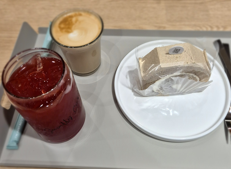 아쉽게도 디카페인이 없어서 저는 히비스커스망고아이스티를 주문했습니다. 함께 동행한 동행인은 플랫화이트를 주문했고 로얄밀크티롤을 같이 주문했습니다.ㅎㅎ