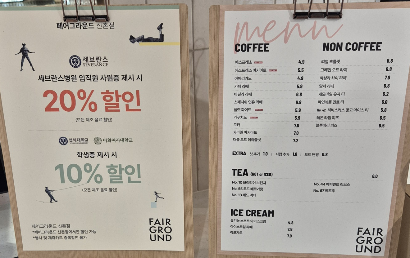 주문을 하면 왼쪽에 있는 진동벨이 나오는데 챙겨가면 됩니다.ㅎㅎ 그리고 세브란스 직원은 20%, 연대, 이대학생들은 10%할인이 된다고 해요! 공부하는 학생들보다 직원 할인률이 더 높네요.ㅎㅎㅎ