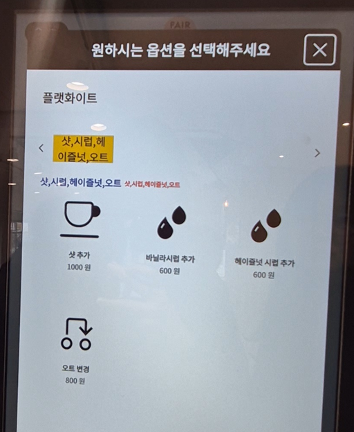 플랫화이트 주문할 땐 원두, 우유 양, 추가적 옵션을 선택할 수 있었어요.ㅎㅎ 너무 좋은 건 우유 양 요청도 0원이네요.ㅎㅎ
