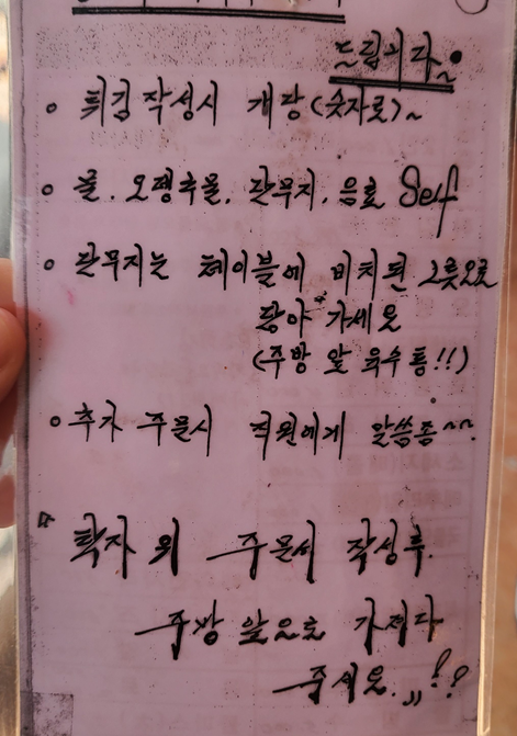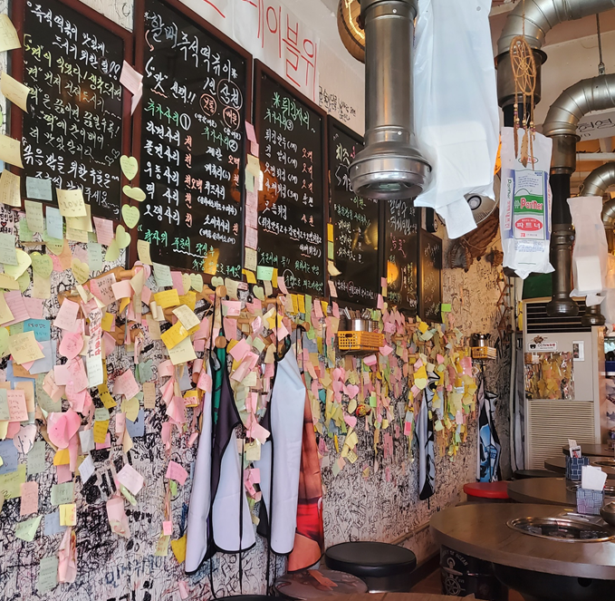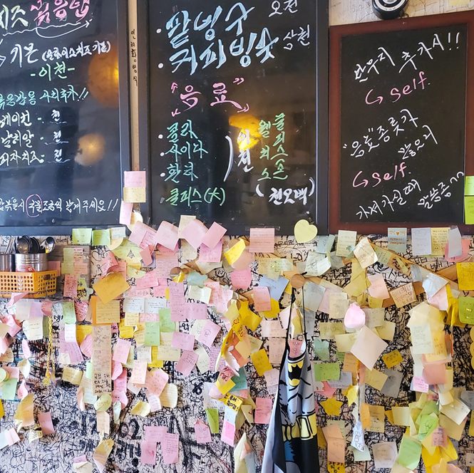 어릴 적 다니던 분식집처럼 포스티잇과 온갖 낙서들이 많아 옛 생각이 많이 났습니다. ㅎㅎ 여전히 오시는 분들이 포스트잇을 붙일 수 있게 테이블마다 포스트잇과 펜이 놓여 있더라고요.ㅎㅎ 저도 하나 남기고 왔습니다.ㅎㅎ