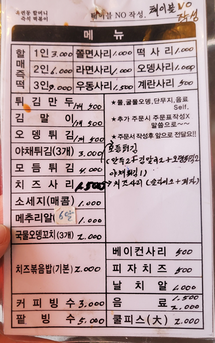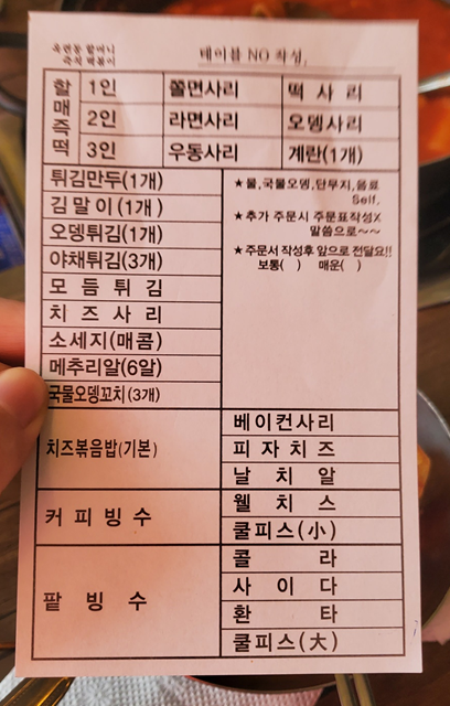 메뉴를 확인하고 메뉴판과 함께 있는 주문서에 작성해서 주방으로 가져다 드리면 됩니다. ㅎㅎ 저희는 즉떡 보통 2인에 쫄면 사리를 추가했고, 튀김 만두, 어묵 튀김, 김말이, 치즈 볶음밥에 날치알도 함께 주문했습니다. ㅎㅎ