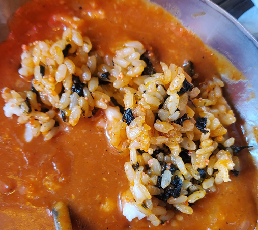 떡볶이를 야무지게 먹은 후 볶음밥을 말씀드리면 사장님께서 재료를 가져다주십니다. ㅎㅎ 볶음밥은 셀프로 볶아 드셔야 해요.ㅎㅎ 우리 학생들을 위해 열심히 맛있게 볶아주었습니다. ㅎㅎ 밥을 다 볶은 후에 더 맛있게 먹기 위해 떡볶이 국물을 자박하게 남겨야 하는 것 잊지 마세요.ㅎㅎ