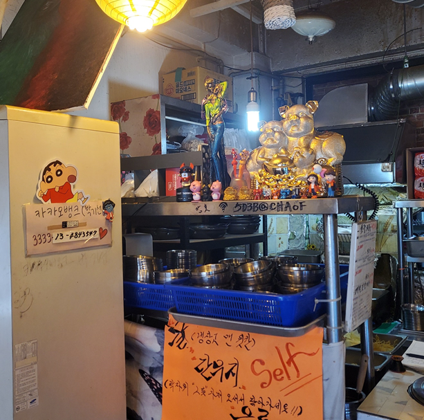 매장은 실내 포차같은 느낌도 있고, 오픈형 주방이라 바로바로 준비하시는 모습이 보였습니다. ㅎㅎ 테이블마다 단무지 담는 접시가 있어 접시를 가지고 주방 앞 단무지 통에서 담아 오면 됩니다.ㅎㅎ