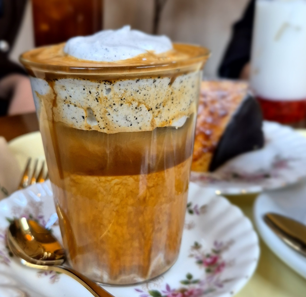 흑임자 크림 라떼입니다. 라떼와 흑임자 크림이 층을 이루고 있는 음료입니다. 크림과 커피를 섞지 말고 마셔야 한다고 설명해 주시더라고요.