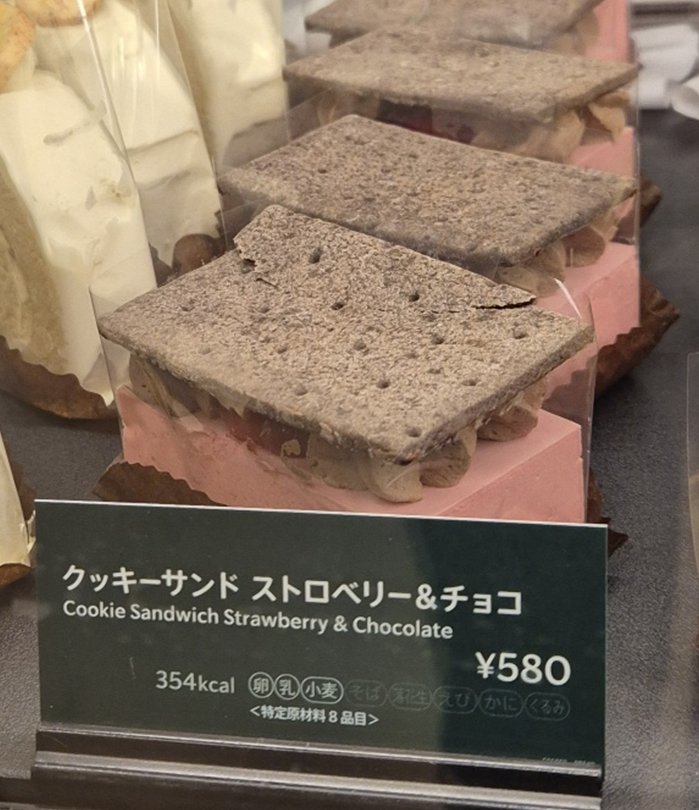 먼저 쿠키 샌드위치 스트로베리 앤 초콜릿입니다. 한 조각에 580엔으로 그래도 한국 디저트들 보다는 저렴한 것 같습니다. 칼로리도 354칼로리로 그래도 한국 디저트들 보다는 적은 칼로리로 볼 수 있는 것 같네요.