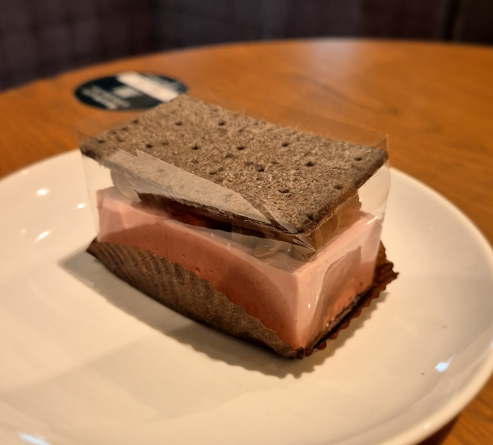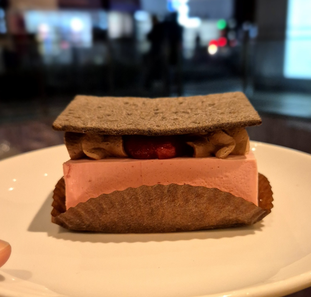 쿠키 사이에 초코 크림과 생딸기가 들어간 딸기 퓌레, 딸기 무스가 층으로 쌓여 있는 샌드 디저트입니다.
