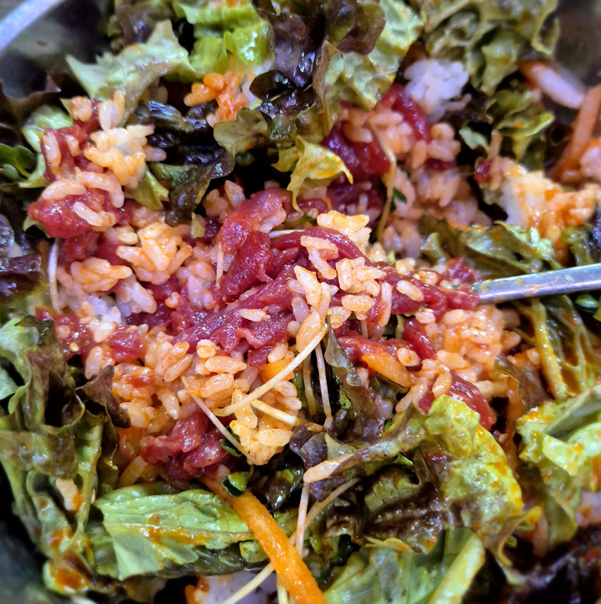 함께 나온 공깃밥을 넣고 테이블에 구비되어 있는 고추장을 취향에 맞게 넣어 비벼주면 됩니다. 고추장 맛은 짭조름한 맛이 강한 고추장이었어요. 입맛마다 달달한 고추장을 좋아하는 취향, 짠 고추장 취향, 초장 취향이 있는데 우가 육회 불고기집은 짠맛이 강한 고추장이었습니다.