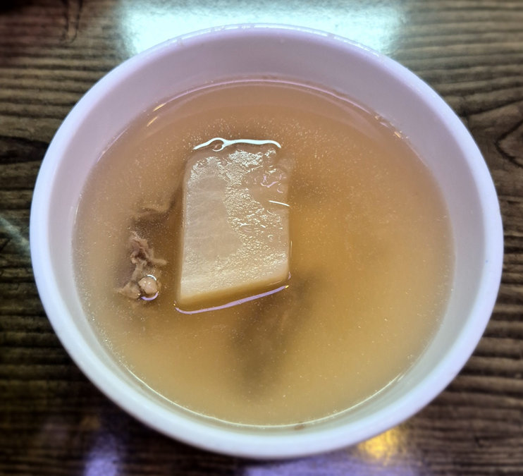 주문을 하면 먼저 밑반찬과 국을 가져다 주십니다. 소고기 뭇국을 가져다주시는데 뭇국도 감칠맛나니 맛이 좋더라고요. 잘게 썬 무가 아니라 무 조각이 하나 들어가 있습니다.
