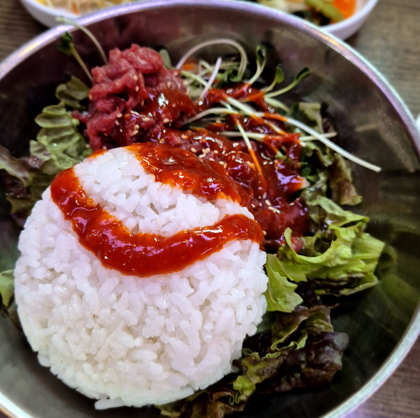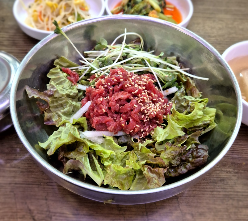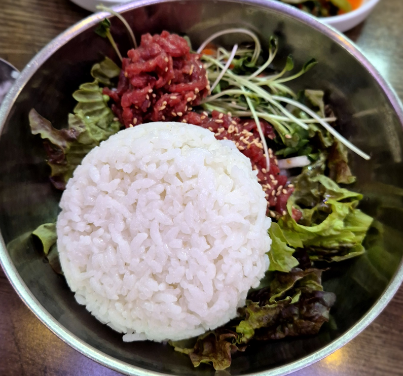 저는 그래도 한우는 좀 다르지 않을까 싶어 한우 육회 비빔밥(14,000원)을 주문했어요. 그런데 주변에 앉으시는 어르신들은 다들 우가육회 비빔밥을 주문하셨습니다. 우가육회를 먹어도 충분히 육회의 맛을 즐길 수 있는 듯합니다.