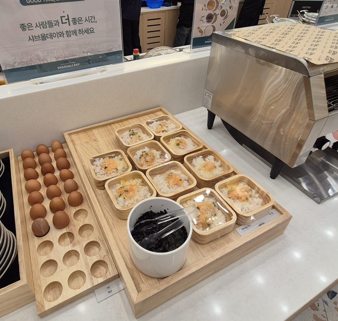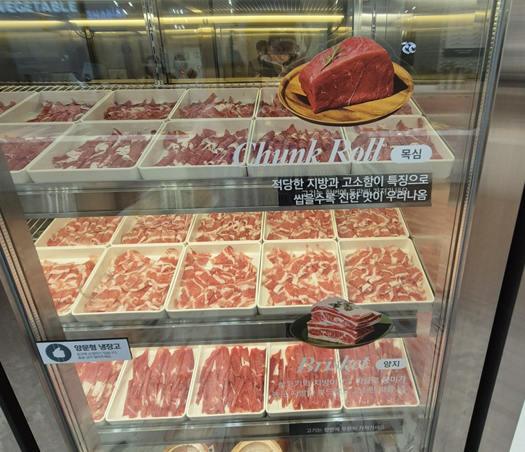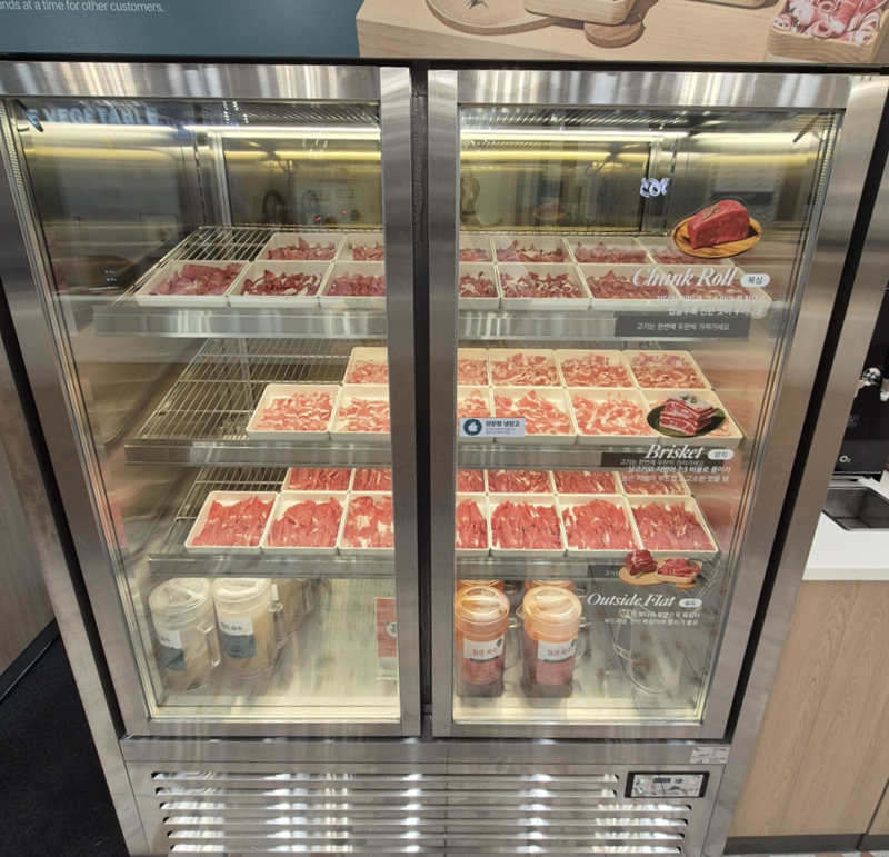 고기는 냉장고 안에 정량으로 준비되어 있었는데 양지, 목심, 설도가 있었고, 밑에 육수도 준비되어 있어요. 이전에 방문했던 다른 샤브 올데이는 실온에 고기가 있었는데 훨씬 더 위생적으로 좋아 보였고, 안심이 되었습니다.