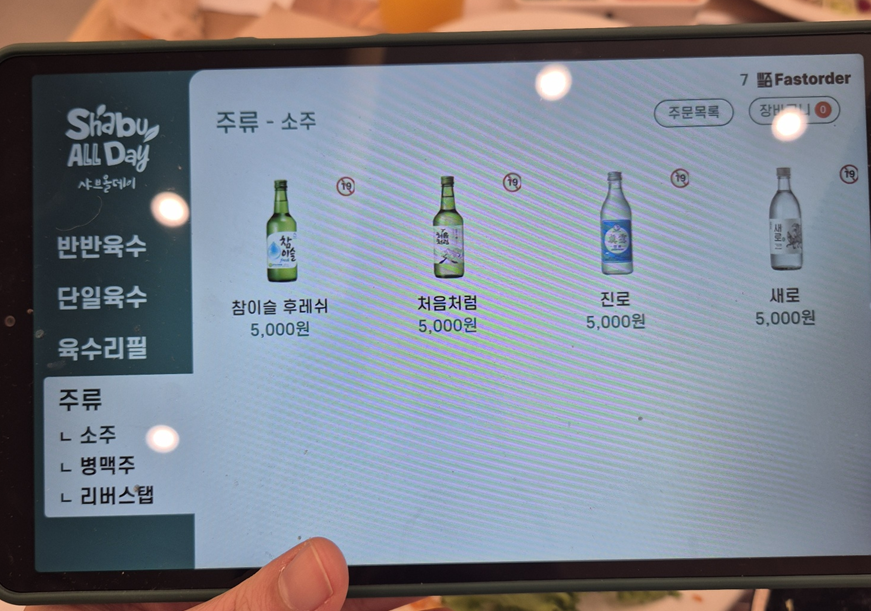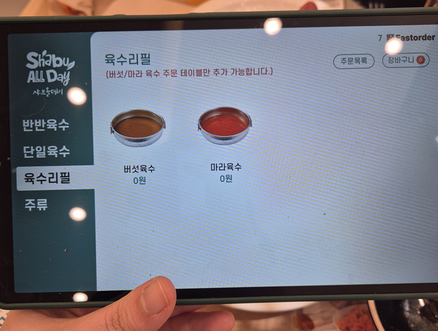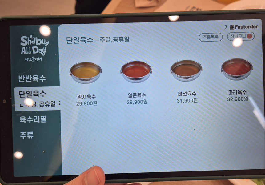 다른 지점에 방문했을 때는 직원한테 주문했었는데 탭이 있더라고요.ㅎㅎㅎ 반반 육수, 단일 육수로 선택할 수 있는데 저희는 양지 육수로 선택했습니다.