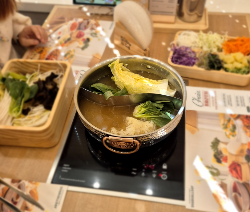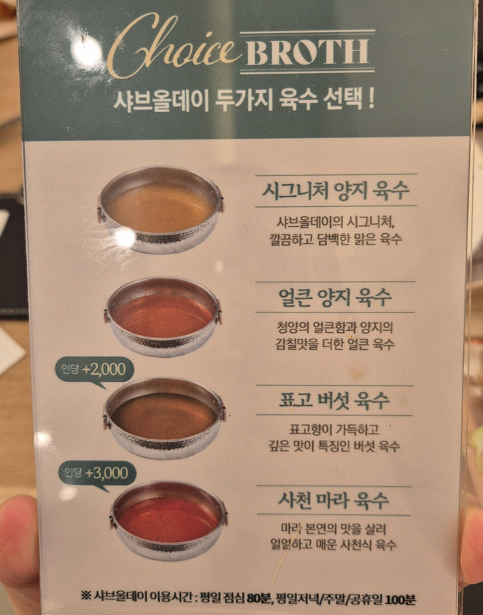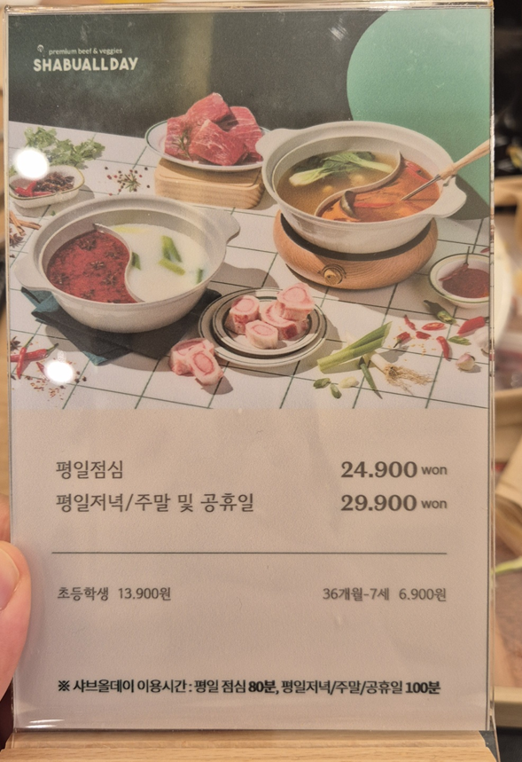 평일 점심은 24,900원, 평일 저녁/주말 및 공휴일은 29,900원이에요. 초등학생은 13,900원, 36개월~7세까지는 6,900원입니다. 육수는 모두 4가지 있어요. 시그니처 양지육수, 얼큰 양지 육수, 표고 버섯 육수, 사천 마라 육수가 있는데 두 가지 육수를 선택하면 됩니다.