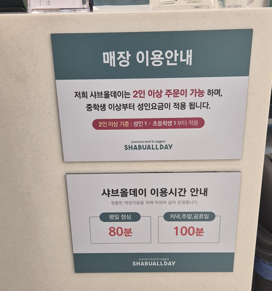 2인 이상 주문 가능했고, 중학생 이상부터 성인 요금이 적용됩니다. 평일 점심은 80분 이용 가능했고, 주말, 저녁, 공휴일은 100분 이용할 수 있어요.