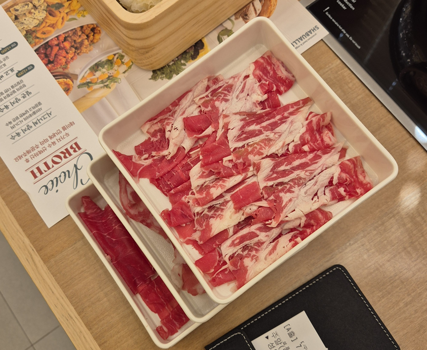고기는 한 번 가져갈 때 3판까지만 가져갈 수 있었어요.ㅎ 종류별로 하나씩 챙겼는데 고기가 얇고 부드러워서 샤브샤브용으로 딱 좋았습니다. 질기지 않고 부드럽게 먹기 좋았습니다.ㅎ