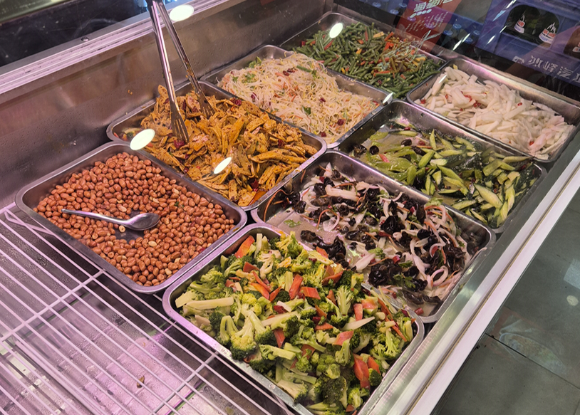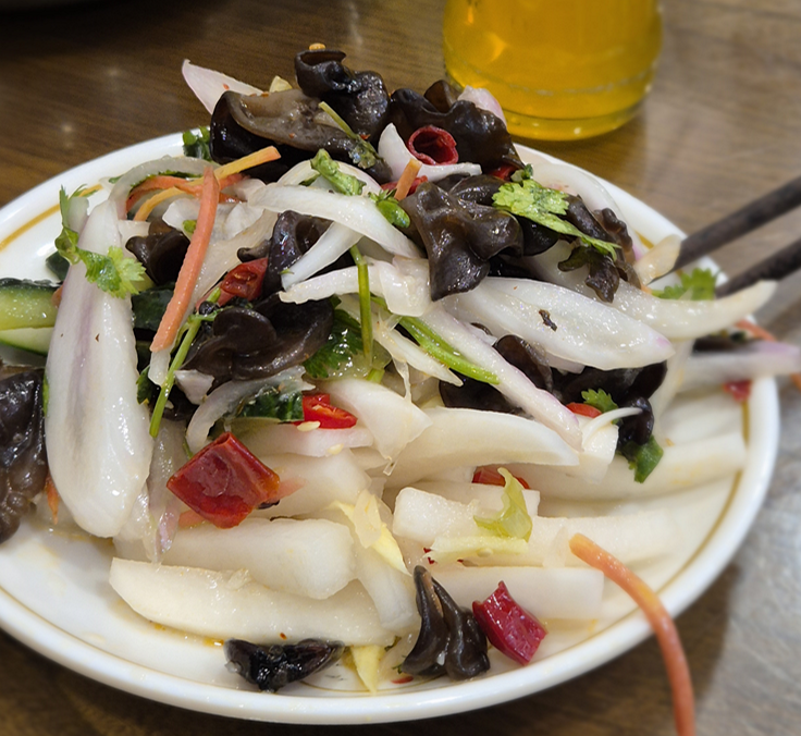 량차이도 추가했는데 돼지 귀나 족발도 주문할 수 있지만 굳지 먹고 싶지 않아서 채소 위주로 주문을 했습니다. 채소 모둠은 12위안, 오향족발은 45위안, 돼지 귀 무침은 57위안이에요. 저희는 무생채와 목이버섯을 함께 주문했습니다.
