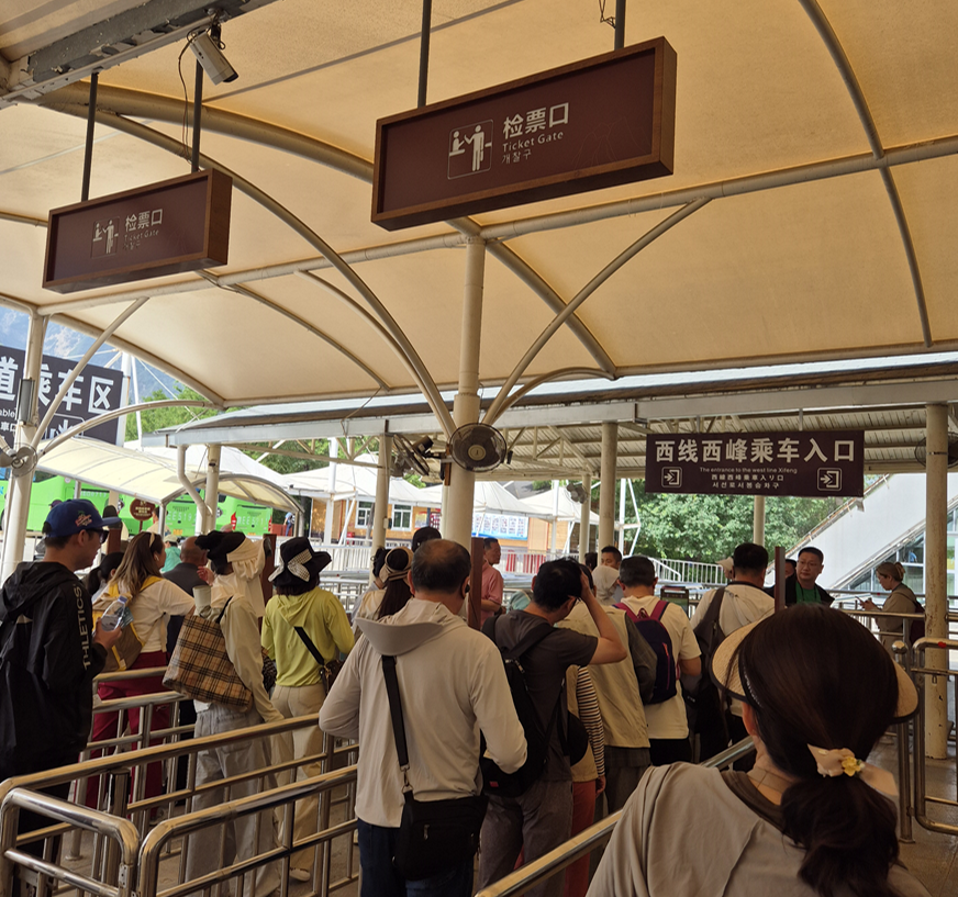 케이블카는 무조건 8명이 타야 하더라고요. 일행이 있어도 앞 케이블카에 사람이 비어 있으면 나뉘어져야 했는데 저희는 운 좋게 찢어지지 않고 네 가족과 가이드 님, 그리고 모르는 중국인 셋과 함께 했습니다.
