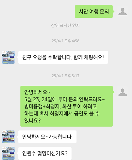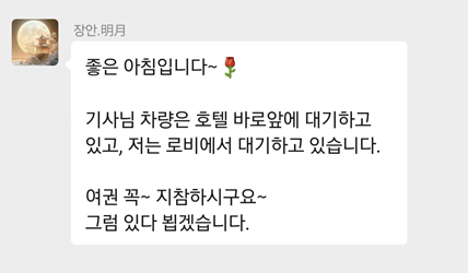 투어 상담은 위챗으로 진행했습니다. 중국 여행 때 위챗페이도 사용해야 하니 가능하면 위챗 설치하는 게 나으실 것 같아요.ㅎㅎ 가끔 알리 페이도 안 될 때가 있어서 번갈아가며 사용했기도 했습니다.