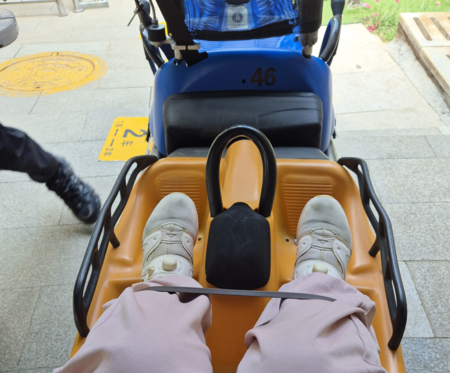 하산할 때는 타고 올라온 모노레일을 타고 내려갈 수 있는데 다리를 묶고 카트도 열차처럼 앞에서 운행해 주시며 안전하게 갑니다.