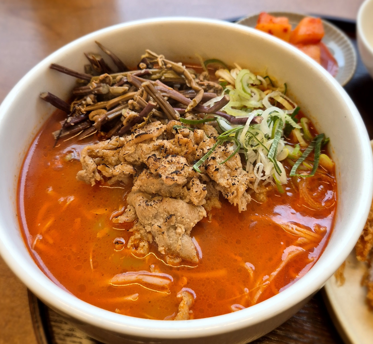 국수에 정신이 팔려 돈카츠를 놓치고 있었는데 식었다 싶으면 얼큰육면 육수에 살짝 찍어 먹어도 맛이 좋답니다. ㅎㅎ 얼큰한 맛으로 느끼할 수 있는 튀김의 단점을 잡아줄 수 있어요. ㅎㅎ