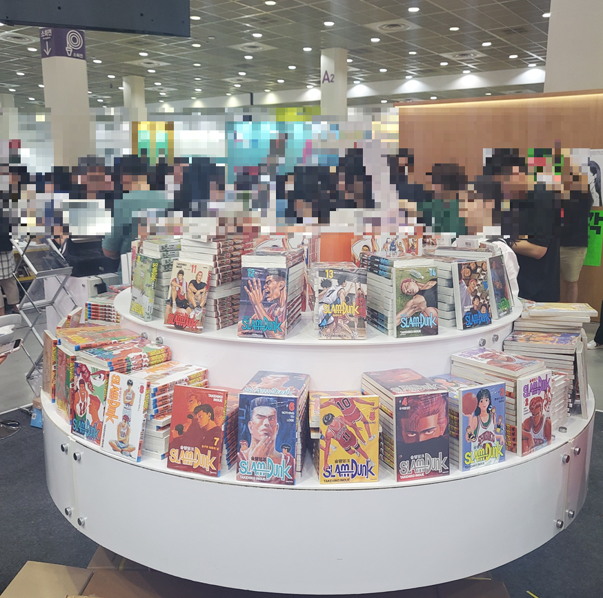 저는 민음사 책을 좋아해서 민음사를 찾아 가고 있었는데 마침 바로 옆에 슬램덩크 단독 부스를 설치한 대원씨아이 부스가 있더군요! 저 많은 인파들..!! 저도 부탁받은 것도 있고, 간 김에 구경해봐야겠다 싶었는데 부스 두 곳을 두르고 있을 정도로 줄이 정말 길었어요! 부탁은 받았는데 어찌 사야 할지 막막하지만 다른 책을 구경하기 전에 먼저 슬램덩크를 구매하려고 줄을 섰습니다..ㅎㅎ