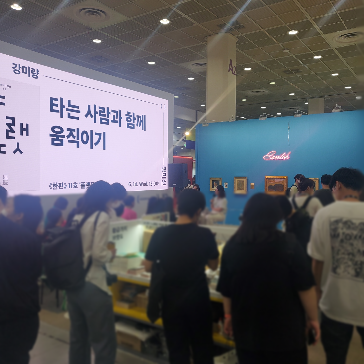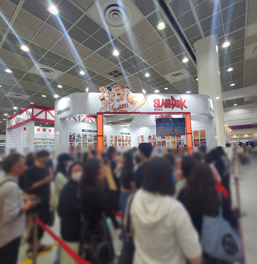 저는 민음사 책을 좋아해서 민음사를 찾아 가고 있었는데 마침 바로 옆에 슬램덩크 단독 부스를 설치한 대원씨아이 부스가 있더군요! 저 많은 인파들..!! 저도 부탁받은 것도 있고, 간 김에 구경해봐야겠다 싶었는데 부스 두 곳을 두르고 있을 정도로 줄이 정말 길었어요! 부탁은 받았는데 어찌 사야 할지 막막하지만 다른 책을 구경하기 전에 먼저 슬램덩크를 구매하려고 줄을 섰습니다..ㅎㅎ