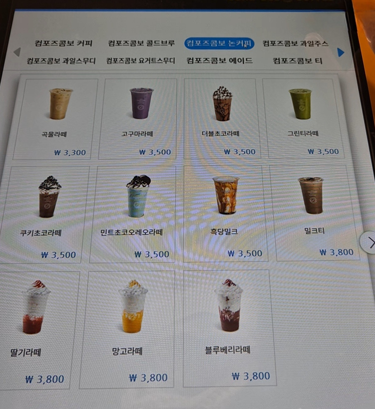 주문하기 위해 키오스크에서 컴포즈 콤보 탭을 누르면 이렇게 음료와 토핑을 선택하도록 되어 있습니다. ㅎㅎ 아쉽지만 음료는 아이스만 가능해요.ㅎㅎㅎ