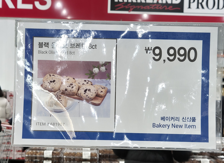 코스트코에 갔을 때 너무 맛있어 보이는 빵이 있어 하나 집어 왔습니다.ㅎㅎㅎ 코스트코 베이커리는 가성비 갑으로 유명하죠.ㅎㅎ 제가 가져온 블랙 올리브 브레드도 8개에 9,990원이었습니다. ㅎㅎ 8개가 들어 있는데 하나당 1,200원 조금 넘는 가격인 거라 생각하면 정말 저렴한 빵이었어요.ㅎㅎ